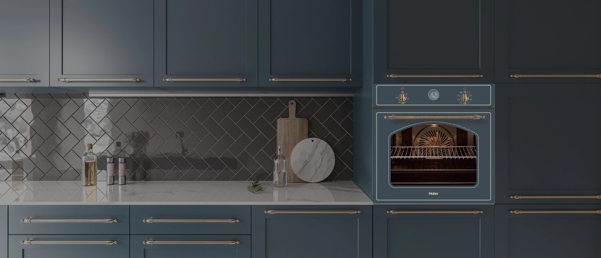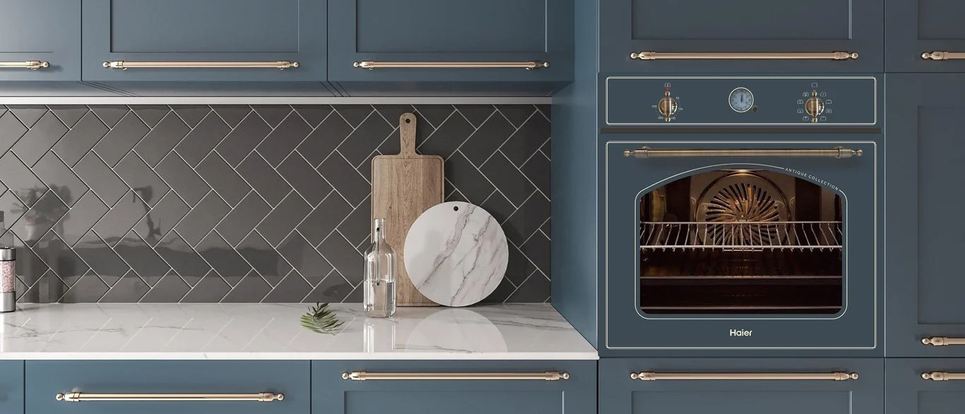 Элементы классического дизайна создадут атмосферу уюта. Таймер управления временем приготовления в форме традиционного циферблата часов и изящные регуляторы и ручка дверцы хорошо сочетаются с классическим стилем кухонной мебели.