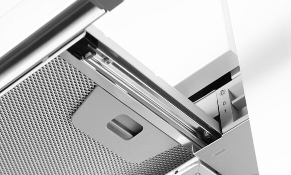 Чтобы вытяжка работала максимально эффективно, нужно лишь потянуть на себя выдвижную панель на телескопических направляющих. Когда готовка окончена — просто задвиньте её обратно. Отличный вариант для любой кухни.